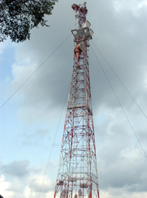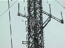 Rob Noble, a Cary Firefighter and tower rigger for Nav-Com Communications, climbing the Raleigh Hub repeater tower inspecting cables and removing a UHF link antenna.